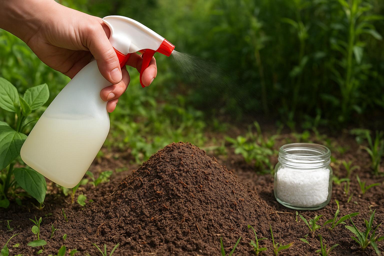 A safe method for both plants and soil. Mix liquid soap with water and spray directly onto ants. The solution breaks down their protective outer layer, killing them effectively.